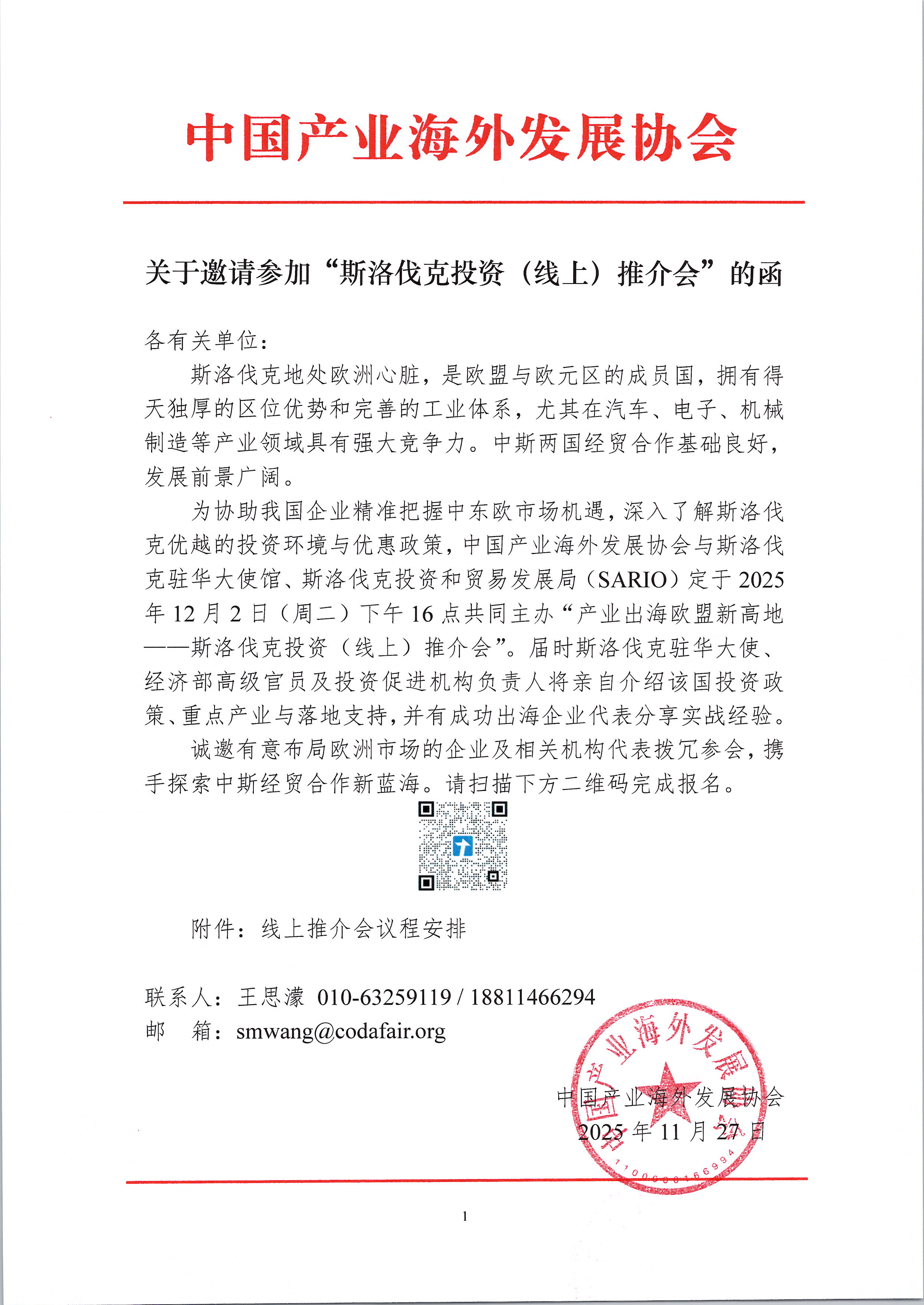 关于邀请参加“斯洛伐克投资(线上)推介会”的函