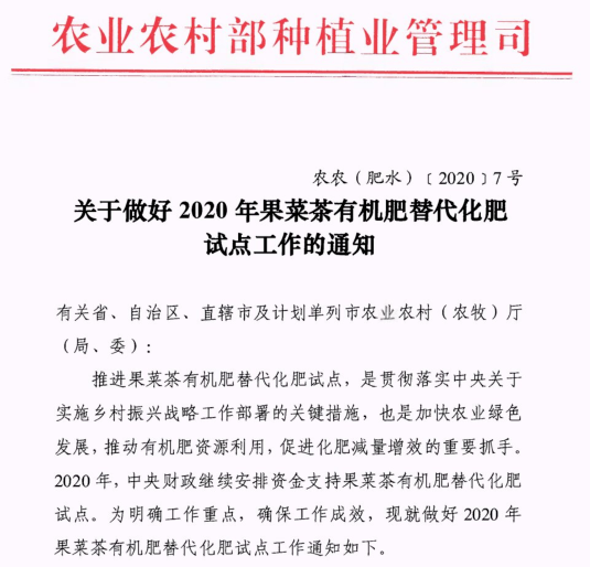 4月28日,农业农村部种植业管理司发布《关于做好2020年果菜茶有机肥替代化肥试点工作的通知》。通知表示,2020年,在完成2018-2019年启动实施的试点任务基础上,再选择63个县(市、区)开展果菜茶有机肥替代化肥试点。