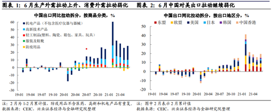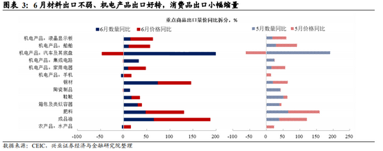 出口:生产类外需有基础性支撑,消费类外需较弱。6月,出口同比增速上升,主要体现以下特征:1)分产品出口同比拉动看,机电、高新技术产品出口拉动上升,生产类外需对出口仍有基础性支撑;防疫用品出口拉动继续为负,但较上月出现缓解,一方面或有2020年6月开始防疫用品出口基数效应下行影响,此外可能也受近期Delta变异病毒蔓延影响;服装衣着出口拉动继续弱化,消费类外需不强。2)从重点商品出口同比量价拆分看,偏企业端的材料(成品油、钢材、肥料)出口不弱、机电产品(数据处理设备、集成电路)出口好转,偏需求终端的消费品(鞋靴、箱包、手机)出口小幅缩量,也反映生产类外需稳、消费类外需弱的特征。3)从出口区域特征看,消费属性强的对美国出口拉动弱化,对东亚和东盟出口拉动出现下降或主要受Delta病毒蔓延影响,对欧盟出口回升。整体来看6月出口数据反映,生产类外需对出口仍有基础性支撑,消费类外需处于较弱状态。