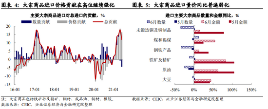 进口:大宗商品进口继续缩量、涨价影响弱化,影响进口走弱。6月,进口同比从前期高点回落,从大宗商品整体进口量价同比贡献看,数量贡献在前期跌至负值区间后继续走弱,较上月下降3.7个百分点,价格贡献从前期高点回落,较上月下降2.2个百分点。从细分商品进口看,6月,铜、钢、铁、油进口均现量价齐跌,尤其是铜、钢产品进口数量同比跌幅超过30%。整体来看,6月价格贡献回落反映随着国际铜价回落、煤价趋稳,大宗商品涨价对进口的拉动弱化,数量贡献的回落结合前期PMI指标走弱来看,或反映疫后经济恢复下半场阶段,生产动能走稳、进口需求走弱。
