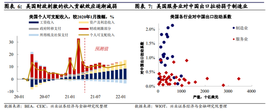 展望:全球复苏生产共振对出口有基础支撑,但消费类外需或将呈较弱趋势。从生产类外需看,今年以来生产性外需持续是支撑出口的基础性力量,后续随着全球复苏持续、全球生产将继续恢复,全球产业链恢复共振逻辑将继续演绎,生产类外需对我国出口的基础性支撑将会延续(详见20210607《哪些因素影响出口低于预期》)。消费类外需方面,前期在财政刺激“发钱”影响下,美国商品消费尤其是耐用品消费或已有所透支,后续美国“发钱结束”的影响或将逐渐显现,美国消费复苏主线将从商品转向服务,从全球投入产出表分析来看,美国服务业对中国出口的拉动要低于制造业(详见20210607《覆水难收》),后续消费类外需对出口的支撑或将继续呈较弱趋势。
