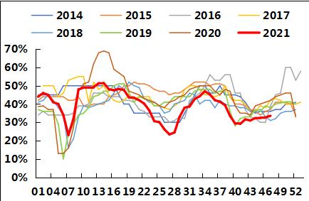 导致尿素价格上行乏力最重要的因素就是需求端的疲弱。现阶段国内农业需求较为清淡,对尿素消费刺激有限,市场更多关注工业需求的变化。而工业需求的终端负荷表现不及预期,进一步加大产业的累库压力。据卓创数据显示,截止11月底,复合肥开工率约35.7%,较上月小幅走高。从复合肥负荷趋势表现来看,开工增量较低,对原料尿素无法形成较强支撑。今年11月复合肥开工增幅约3%(32%增至35%),而去年复合肥负荷增幅达6%(38%涨至44%)。对比去年同期的负荷增量变化,我们可以明显发现,今年下游需求的增量较弱。此外,从季节性表现的绝对量来看,今年复合肥的开工率也远低于去年同期水平。究其原因,前期原料价格过高导致复合肥利润欠佳、收款进度放缓,负反馈至尿素端的需求启动延后。