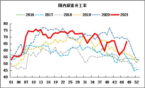 如下图所示,我们不难发现,近期国内尿素开工出现明显回升。据隆众数据统计显示,截止11月27日尿素开工负荷约66.48%,环比大幅走高。其中煤头企业开工涨至67.92%,天然气制装置负荷降至62.39%。从不同工艺制尿素的开工表现可以明显看出,即便气头装置负荷节节下降,国内尿素开工负荷依然大幅上扬,而这部分负荷增量主要来自于煤头装置的集中复产。装置快速恢复同时需求端却出现延后,导致产业持续累库并令尿素价格承压。