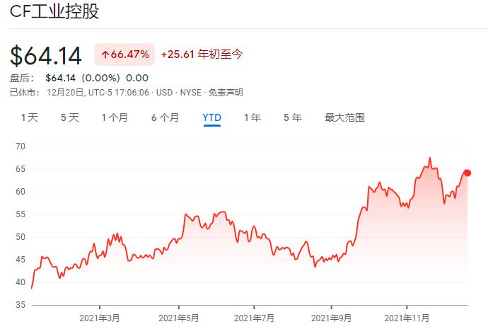 其中,全球氮肥巨头CF工业(CF Industries Holdings Inc.)无疑是年内化肥行业的领头羊。截止上周五,该公司股价在年内累计已飙升了67%,有望创下2009年以来最佳的年度表现。