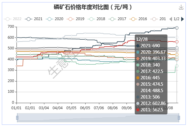 根据监测数据显示,年初国内磷矿石出厂均价参考为396元/吨,年末出厂均价参考为690元/吨,全年整体跌幅73.95%。