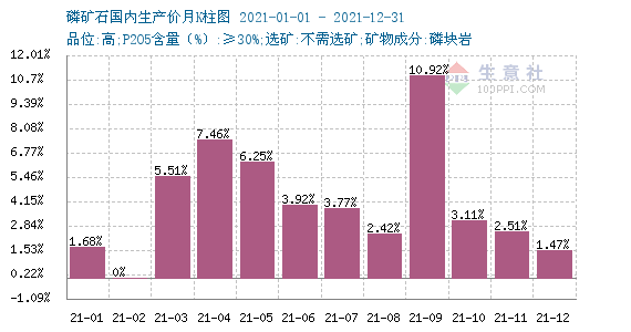 第四季度,10月份,贵州地区磷矿石行情继续小幅上调,30%品位磷矿石货厂价格参考630-660元/吨,以磷矿石(折含五氧化二磷30%品位)为例,年初1月,国内30%品位磷矿石市场均价参考396元/吨,10月末时,30%品位磷矿石市场均价参考663元/吨,均价已上涨267元/吨,涨幅达67.22%。11月份,磷矿石市场整体涨势未有停歇,河北等地中高端品位磷矿石价格继续上涨,11月涨幅2.51%。12月份,贵州等地区30%品位磷矿石低端报价再度小幅上移,场内30%品位磷矿石市场价格参考640-670元/吨附近,截止12月27日,12月涨幅1.47%。四季度累计涨幅7.25%。
