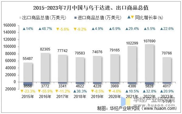 中乌两国自1962年建交以来一直保持着友好关系,在经贸联系和经济技术上的合作进展顺利。据华经情报网报道:2023年7月中国与乌干达双边货物进出口额为10345.2万美元,其中中国对乌干达出口商品总值为9743.56万美元,中国自乌干达进口商品总值为601.64万美元。