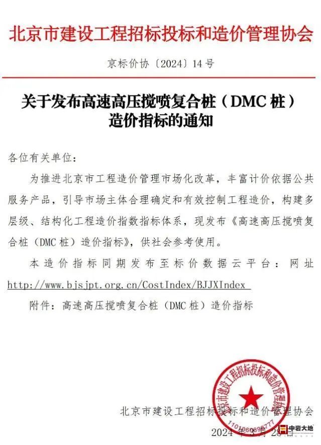3月28日,北京中岩大地科技股份有限公司(以下简称:中岩大地)自研核心技术---高速高压搅喷复合桩(DMC桩)造价指标已由北京市建设工程招标投标和造价管理协会(以下简称:京标价协)发布。此次造价指标的发布也是继河北省住建厅、山东省交通厅发布高速高压搅喷复合桩(DMC桩)相关定额与消耗量标准及计算规则之后,核心技术相关定额布局的又一重大突破。